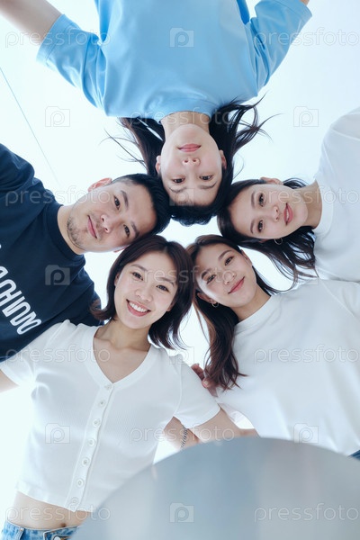 Группа молодых азиатских взрослых, улыбающихся и обнимающих друг друга, глядя вниз