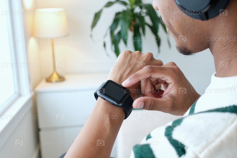 Молодой взрослый чернокожий мужчина использует смарт-часы, слушая музыку в помещении