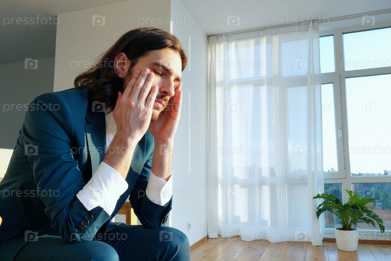 Молодой белый мужчина в костюме сидит внутри, прикасается к лицу и выглядит напряженным