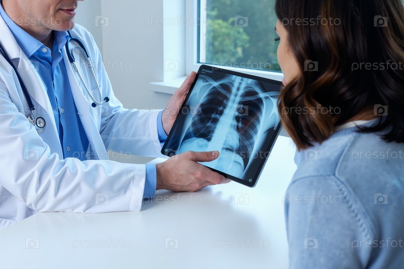 Кавказская женщина молодой взрослый консультирующий врач во время обзора рентгеновского луча грудной клетки