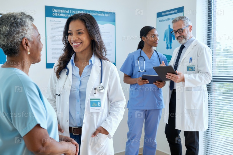 Молодой взрослый чернокожий врач-женщина Greeting Senior Nurse in Medical Clinic