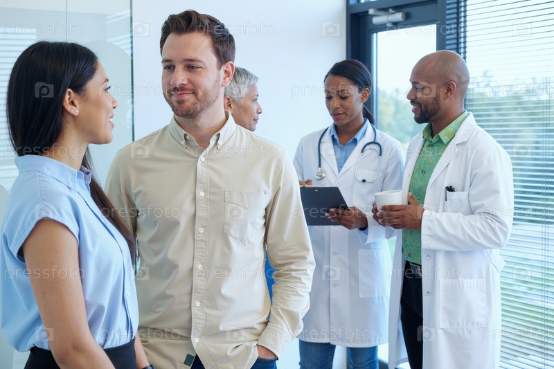 Юный белый мужчина улыбается, разговаривая с молодой азиатской женщиной в клинике
