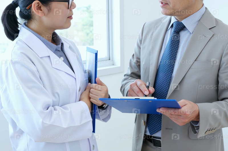 Женщина-врач консультирует среднего возраста белого мужчину из Азии в офисной обстановке