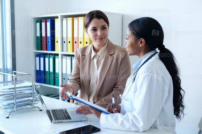 Молодая кавказская женщина консультируется с молодой чернокожей женщиной-врачом в офисе