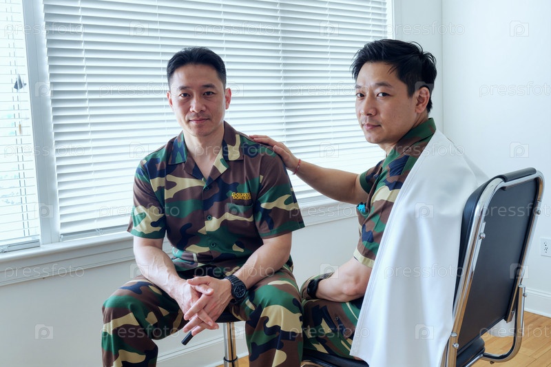 Два молодых азиатских мужчины в камуфляжной форме сидят в больнице