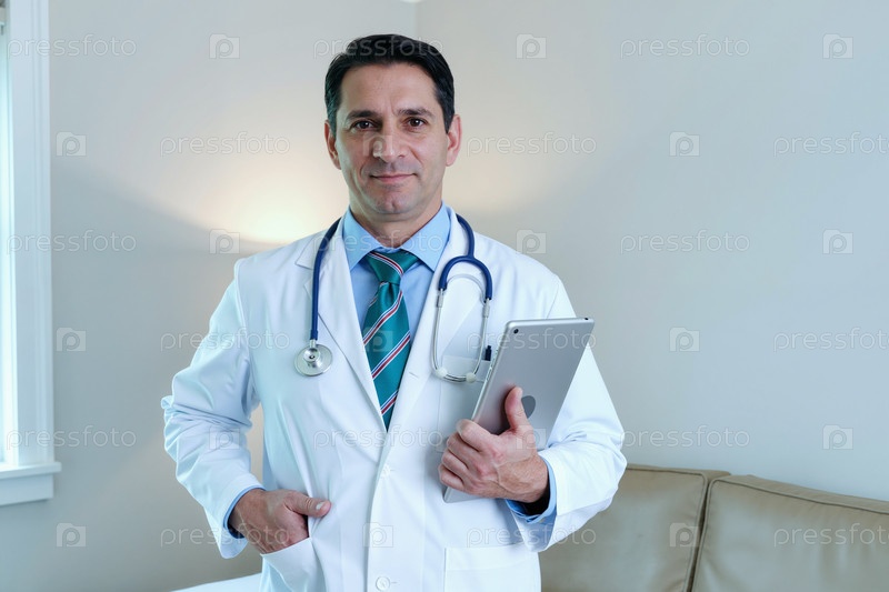 Портрет средневекового кавказского мужчины-врача, держащего цифровую планшету и улыбающегося