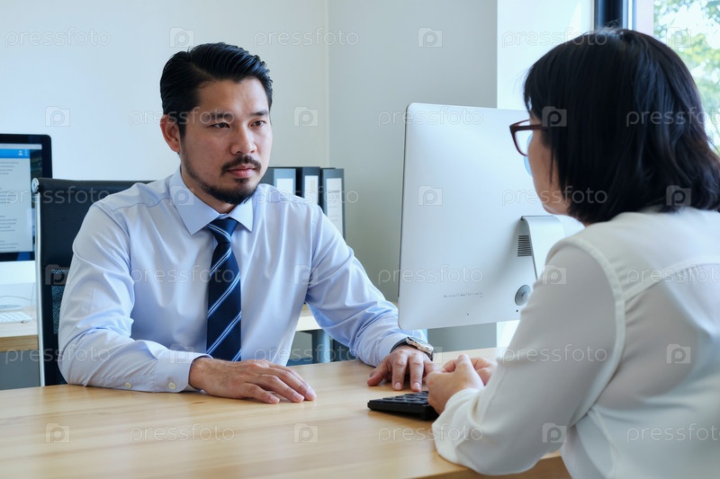 Молодой азиатский мужчина интервьюирует азиатскую женщину в офисной обстановке