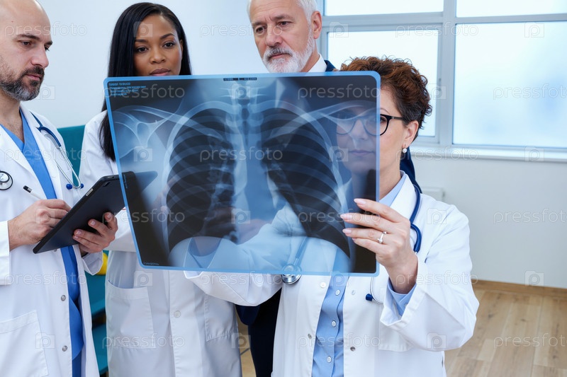 Мультиэтническая группа врачей, анализирующих рентгеновское изображение грудной клетки в условиях больницы