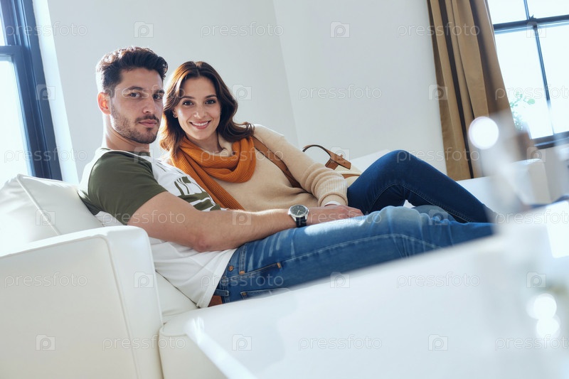 Портрет молодого белого мужчины и женщины, отдыхающих вместе на диване