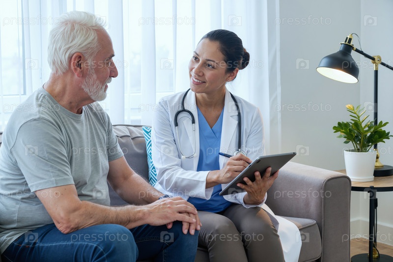 Среднего возраста женщина врач консультирует старшего кавказского мужчину с помощью цифрового планшета
