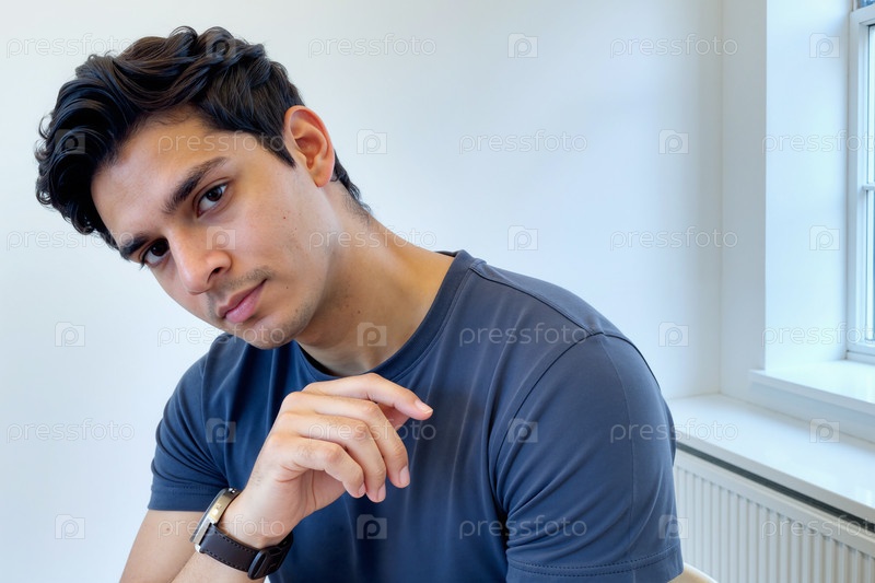 Портрет молодого взрослого белого мужчины, наклонившего голову и смотрящего в камеру