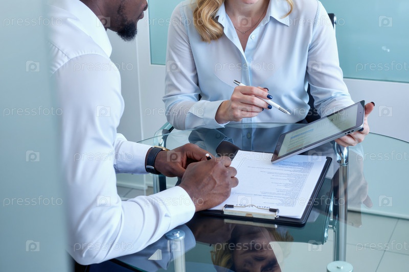 Молодая белая женщина и молодой чернокожий мужчина обсуждают деловые документы вместе