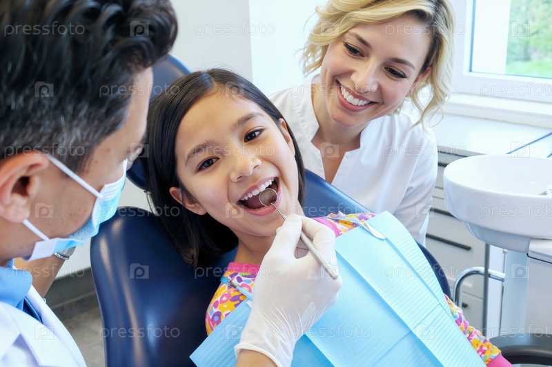 Молодая азиатская девушка сидит в стоматологическом кресле и получает устный осмотр