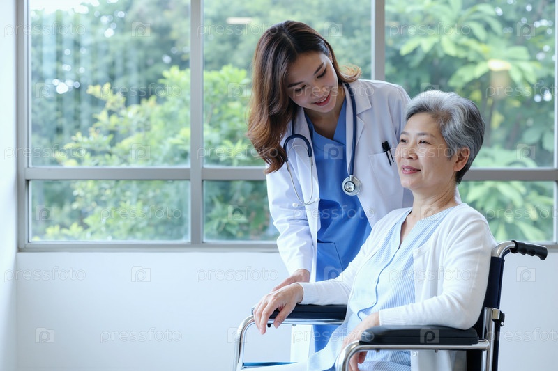 Женщина-врач, помогающая старшей азиатской женщине с инвалидностью в инвалидном кресле