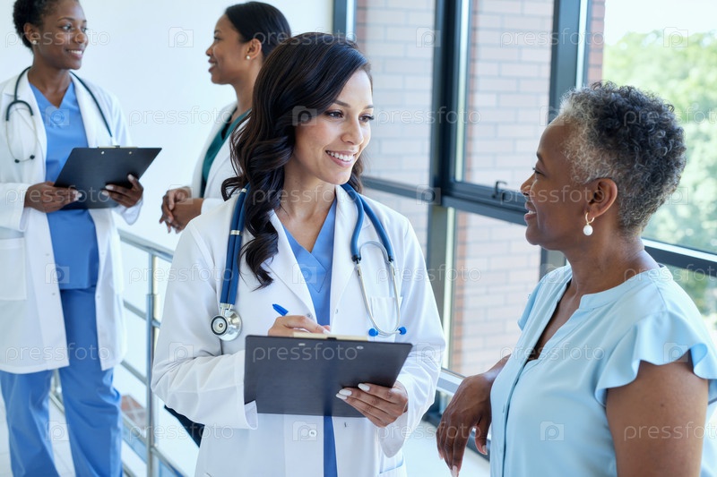 Кавказская женщина-врач консультирует старшую чернокожую женщину в медицинском учреждении