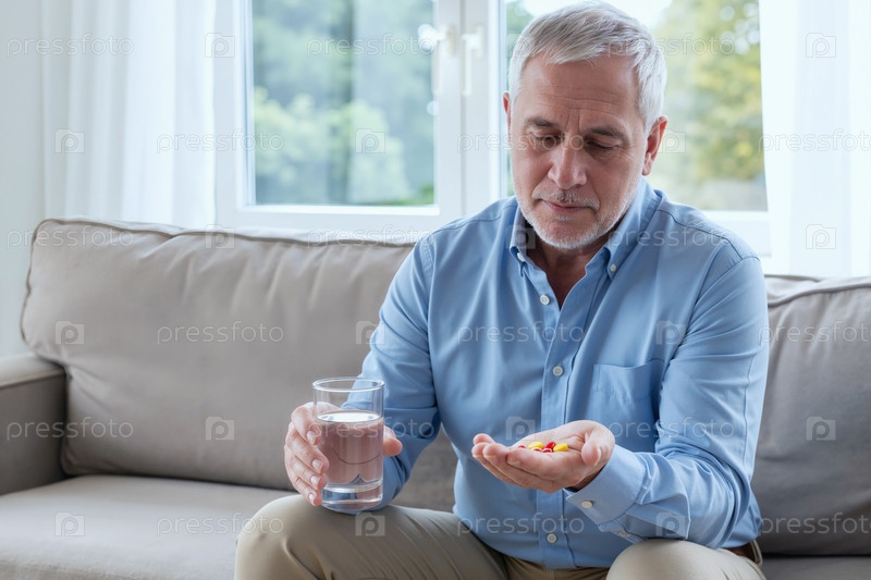 Старший белый мужчина сидит в помещении, держит таблетки и пьет воду