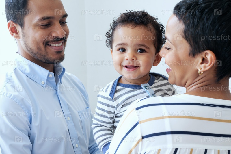Молодые мультиэтнические родители держат улыбающегося мальчика-малыша в помещении вместе