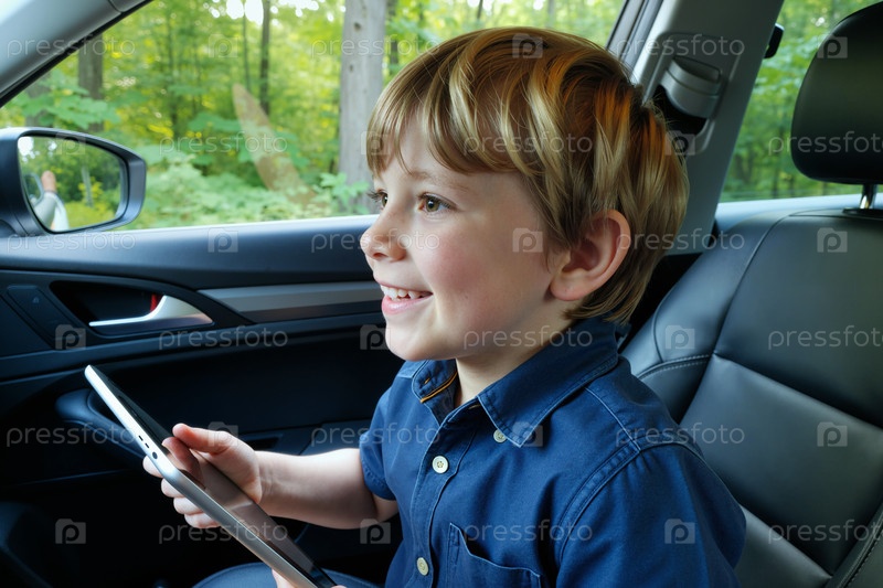 Кавказский мальчик сидит в машине с помощью цифрового планшета и счастливо улыбается