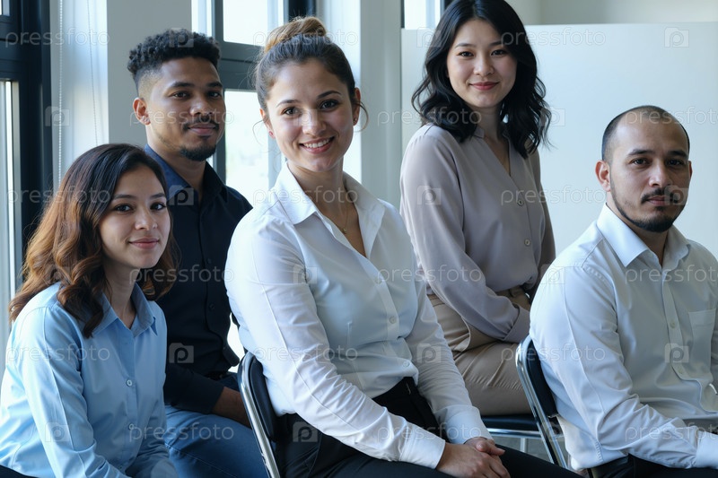 Разнообразные молодые взрослые улыбаются и позируют вместе в современной офисной обстановке