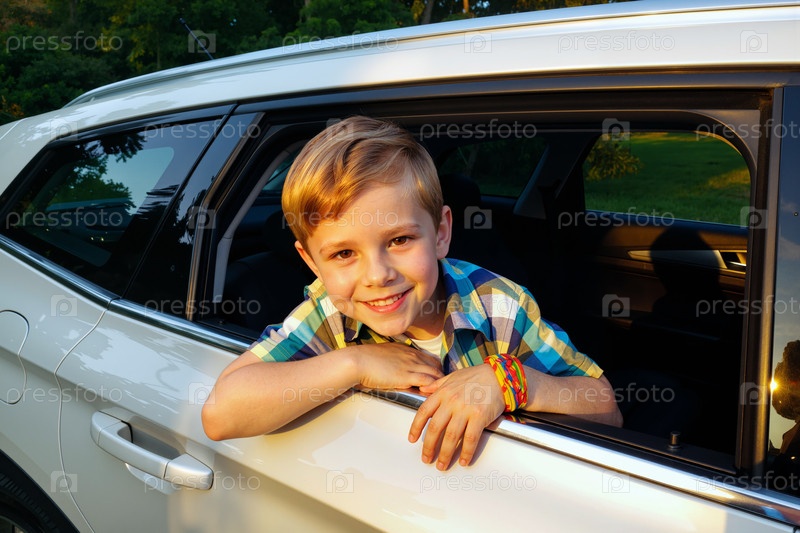 Портрет белого мальчика, улыбающегося, прислонившись к окну машины на закате