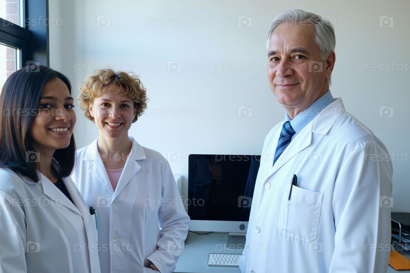 Мультиэтническая медицинская команда, стоящая вместе в больничном кабинете и улыбающаяся