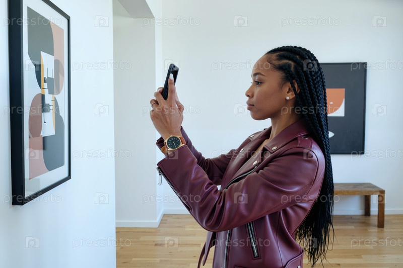Молодая чернокожая женщина фотографирует современные произведения искусства со смартфоном в помещении