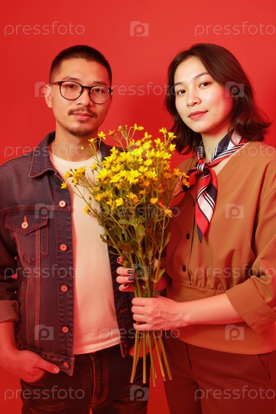 Портрет молодого азиатского мужчины и женщины, держащих желтые цветы на красном фоне