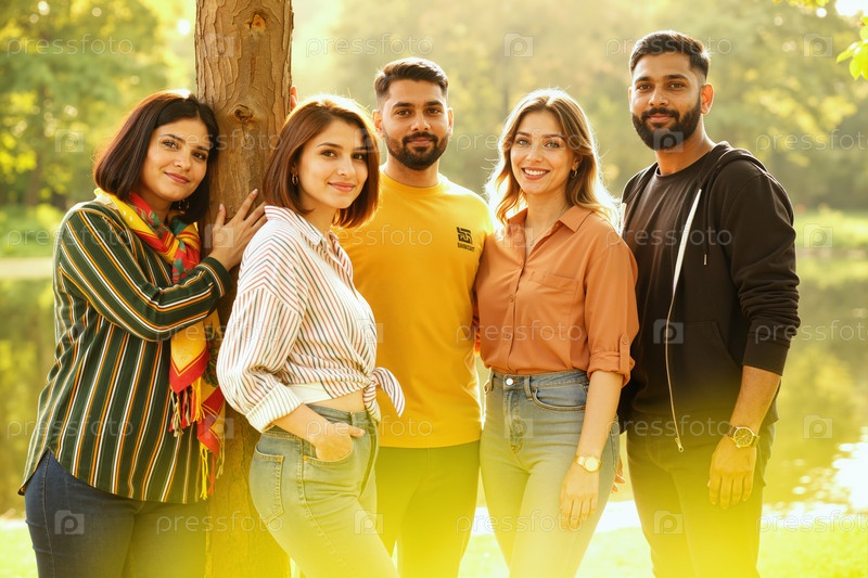 Группа молодых взрослых мультиэтнических друзей, улыбающихся и позирующих на открытом воздухе вместе