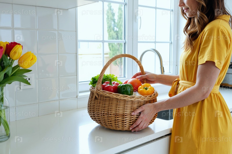Молодая белая женщина готовит свежие овощи на кухне возле окна