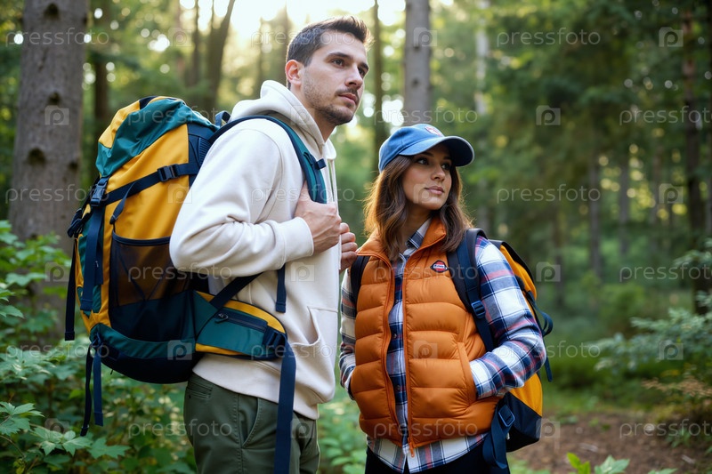 Молодой белый мужчина и женщина вместе ходят в лес днем