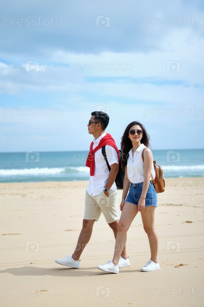Молодой взрослый азиатский мужчина и женщина ходят вместе вдоль береговой линии песчаного пляжа