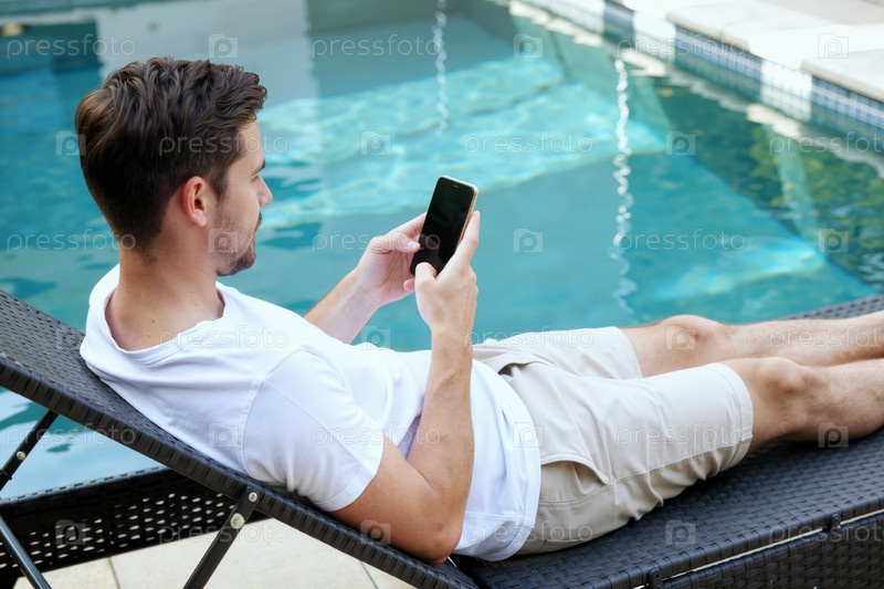 Молодой белый мужчина отдыхает у бассейна, используя смартфон на открытом воздухе