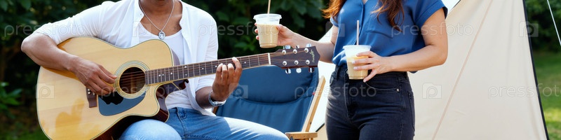 Молодой взрослый чернокожий мужчина играет на гитаре рядом с молодым взрослым белокурой женщиной, которая пьёт