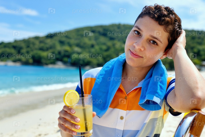 Портрет молодой взрослой белокожей женщины, расслабляющейся с напитками на пляже