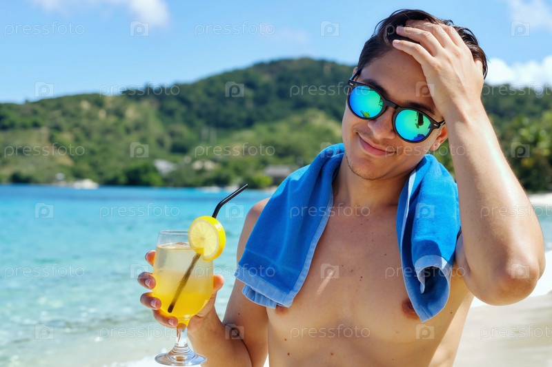 Портрет молодого взрослого белого мужчины, расслабляющегося с напитками на тропическом пляже