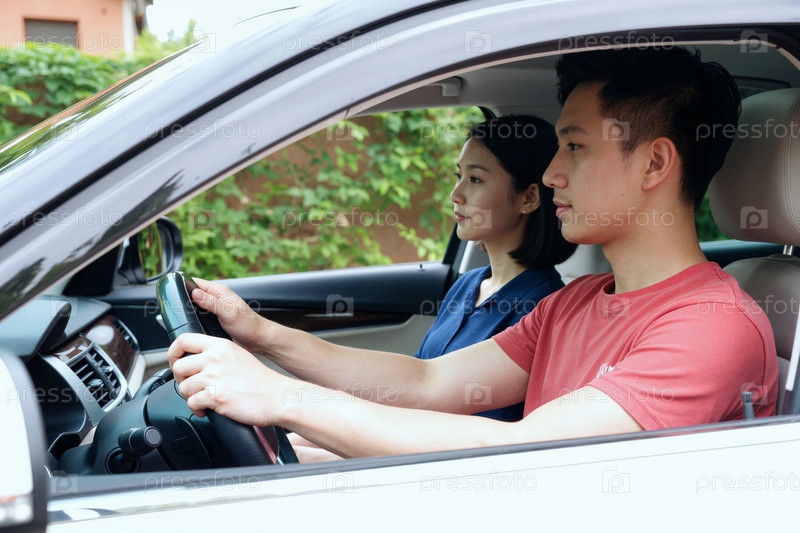 Молодой азиатский мужчина управляет автомобилем с молодой азиатской женщиной, сидящей на пассажирском кресле