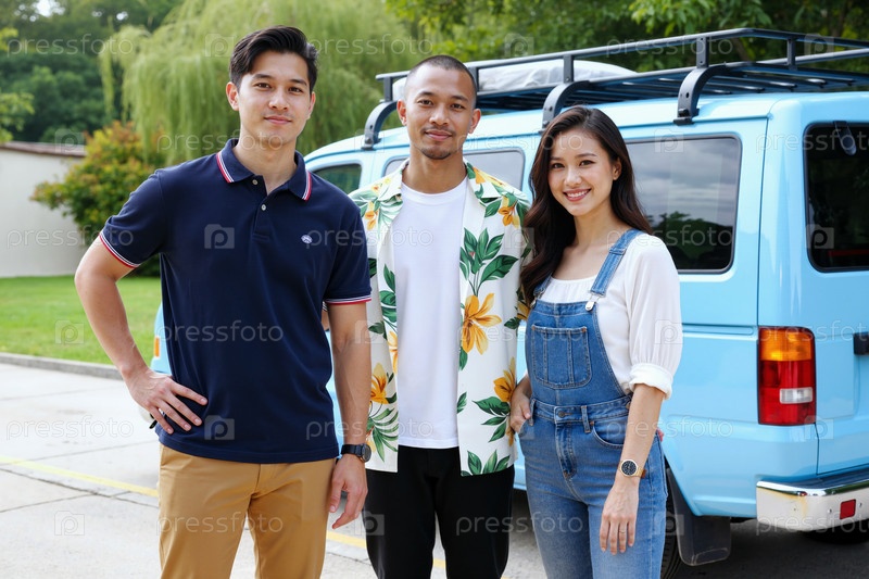 Молодые взрослые азиатские друзья улыбаются на открытом воздухе возле группы Blue Van Group