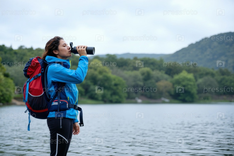Молодая взрослая белая женщина пьет воду во время походов возле озера на открытом воздухе