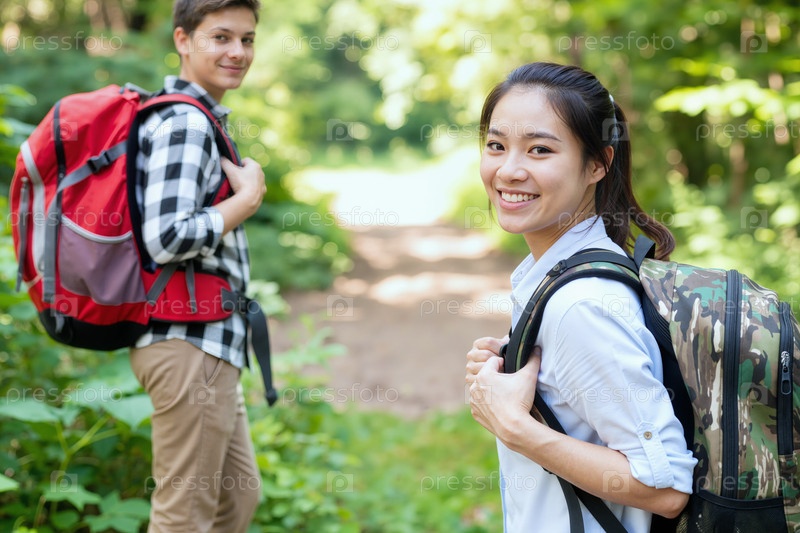Молодая азиатская женщина и белый мальчик-подросток вместе ходят в лес