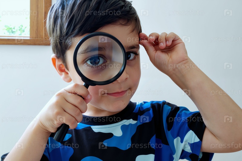 Портрет белого мальчика, осматривающегося через лупу в помещении