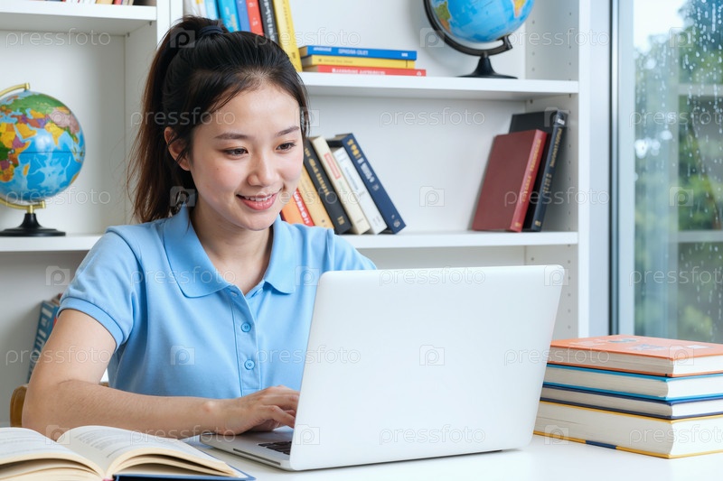 Молодая взрослая азиатская женщина улыбается во время учебы в Интернете с ноутбуком внутри
