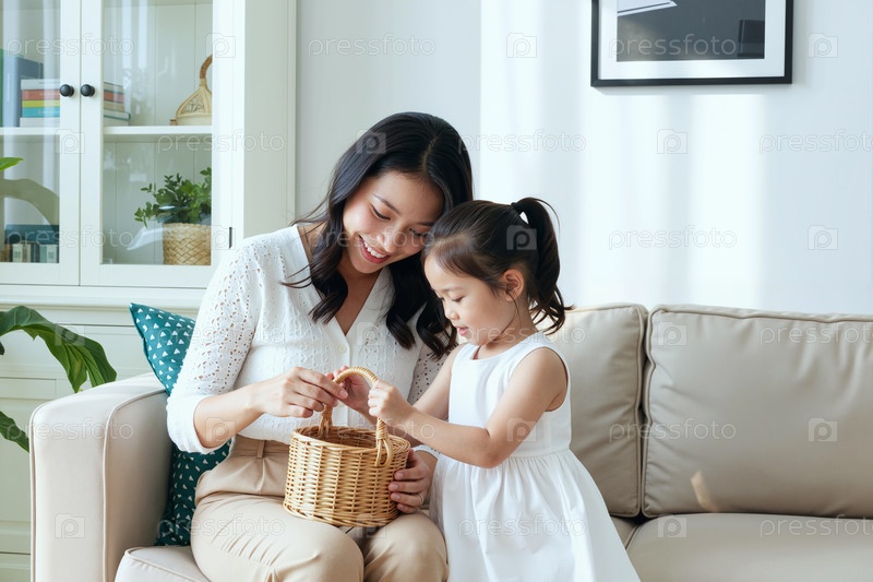 Молодая взрослая женщина помогает дочери Азиатская декоративная корзина в гостиной