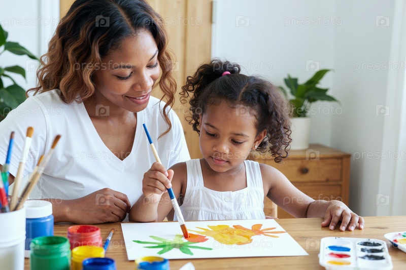 Молодая чернокожая женщина помогает чёрному ребенку рисовать красочные произведения искусства вместе
