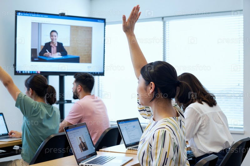 Мультиэтнические молодые взрослые, участвующие в дискуссии в классе о гибридном обучении