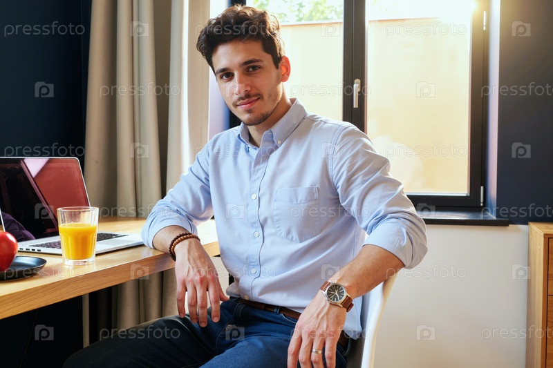 Портрет молодого взрослого белого мужчины, сидящего за столом и работающего удаленно