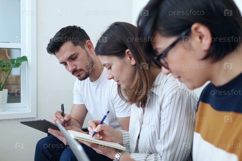 Молодая мультиэтническая команда взрослых сотрудничает и делает заметки во время встречи