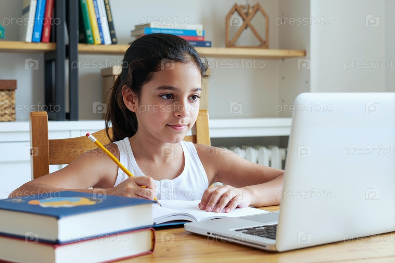 Испанская девушка изучает онлайн с помощью ноутбука и пишет в блокноте дома