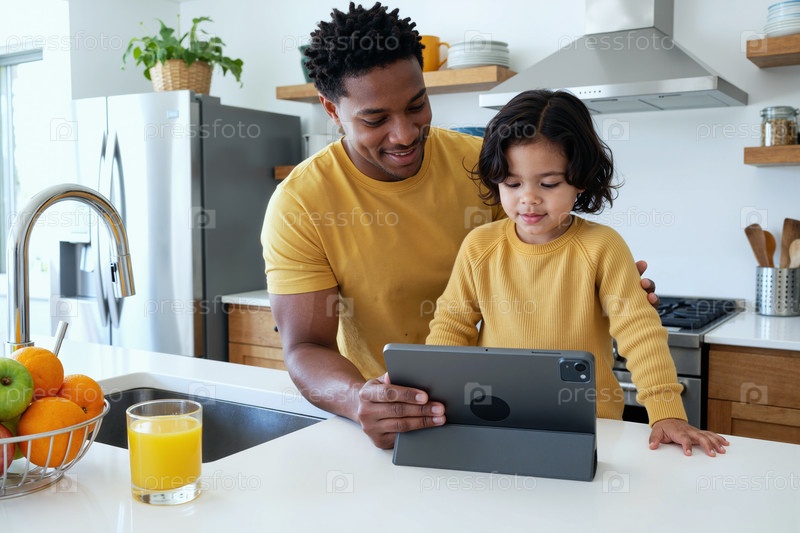Молодой чернокожий мужчина помогает ребенку с помощью цифрового планшета в современной кухне