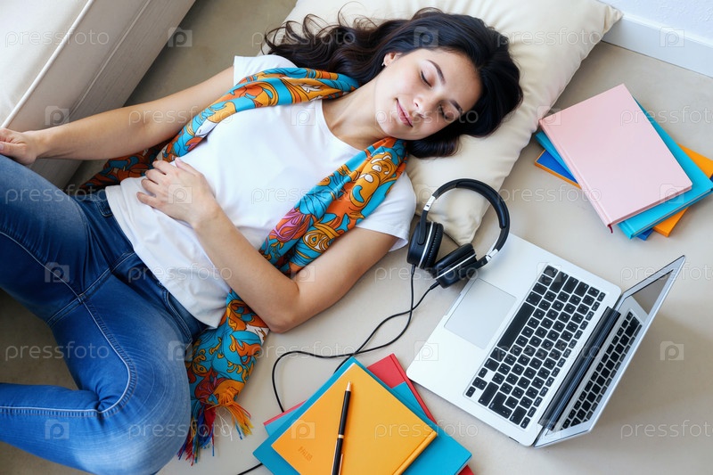 Молодая взрослая белая женщина отдыхает на полу в окружении книг и ноутбука