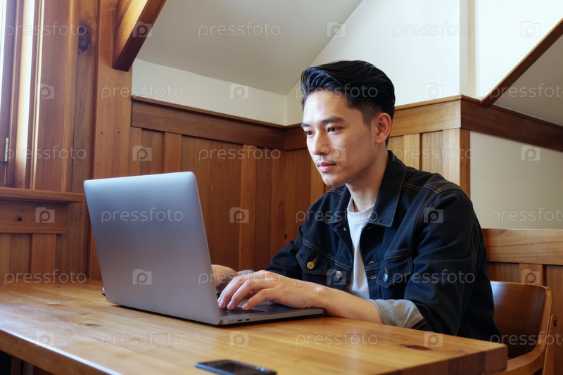 Молодой азиатский мужчина использует ноутбук, работая удаленно в деревянном интерьере